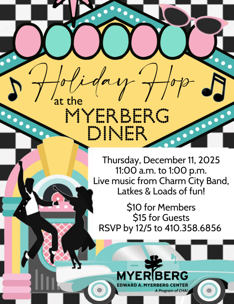 Get ready to twist and shout your way into the holiday season! Enjoy live music by Charm City Band, latkes and loads of fun at the Myerberg Holiday Hop. Thursday December 11, 11:00 a.m. – 1:00 p.m. This event is open to all but registration is required. Members $10, Guests $15.